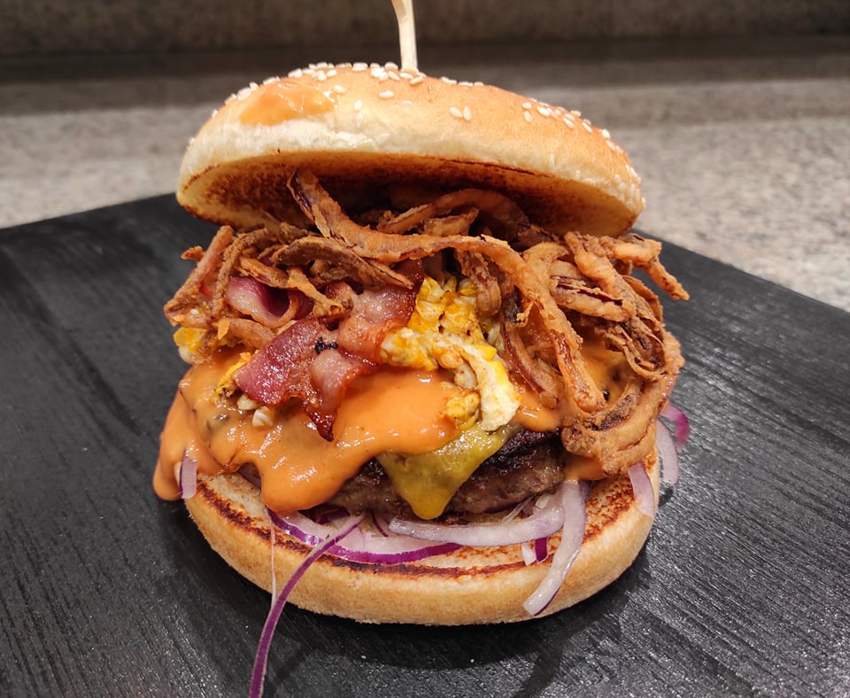 • Buci, Húspogácsa, Sajt, Bacon, Tojásrántotta,