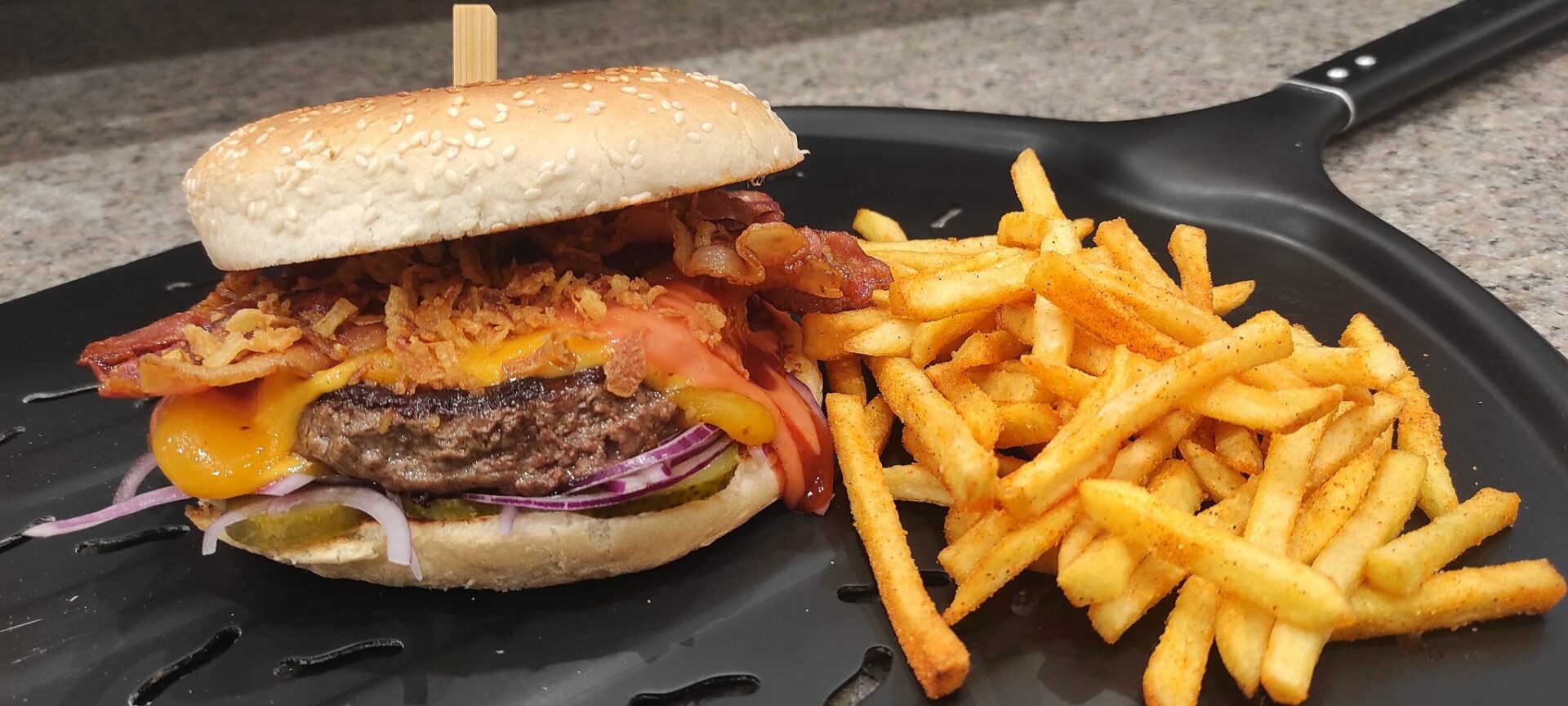 • 160g Kézműves Húspogácsa, dupla Bacon, dupla Vörös Cheddar,
